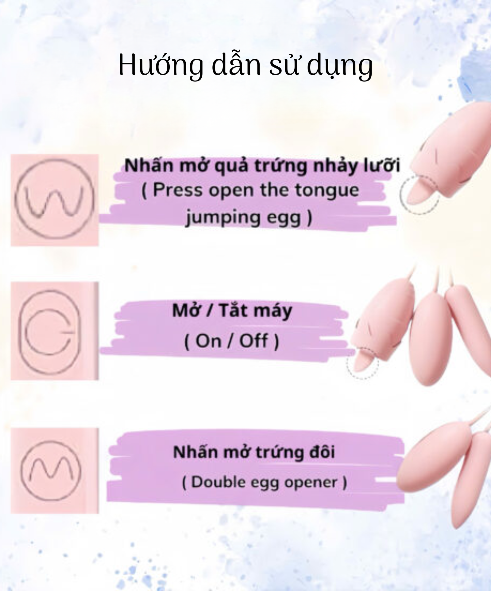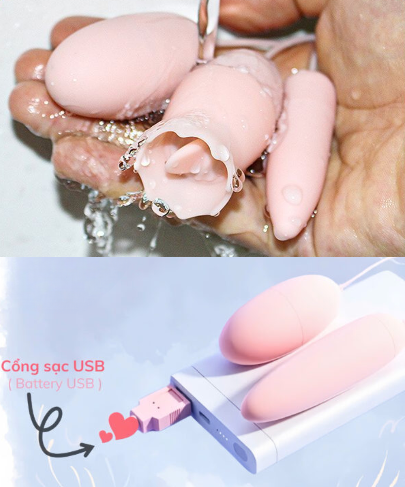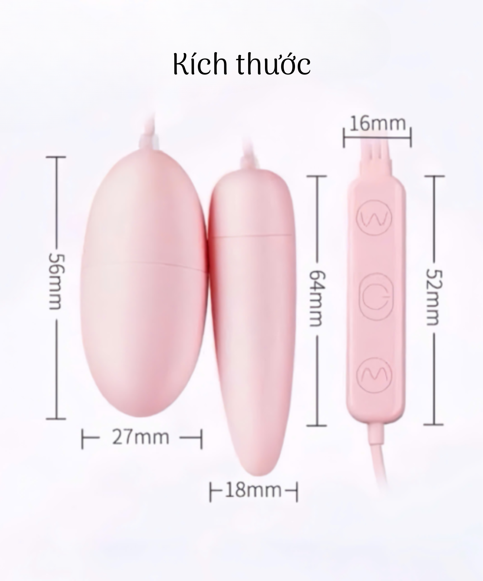 • Sản phẩm gồm 2 quả trứng rung được gắn trực tiếp với bộ phận điều khiển, 1 quả là dạng trứng rung bình thường đầu tròn dài nhỏ, 1 đầu là trứng rung có lưỡi, quả trứng này được nối với bộ phận điều khiển bằng dây.